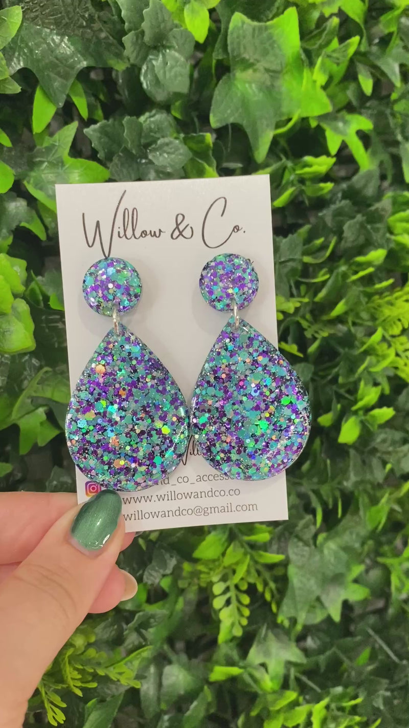 Deep sea sparkle meets magical shimmer. Mystical Mermaid blends oceanic teals, twilight purples, and glints of aqua for a dazzling finish that feels like mermaid treasure. These bold teardrop dangles bring under-the-sea fantasy to everyday style — powerful, playful, and completely enchanting.