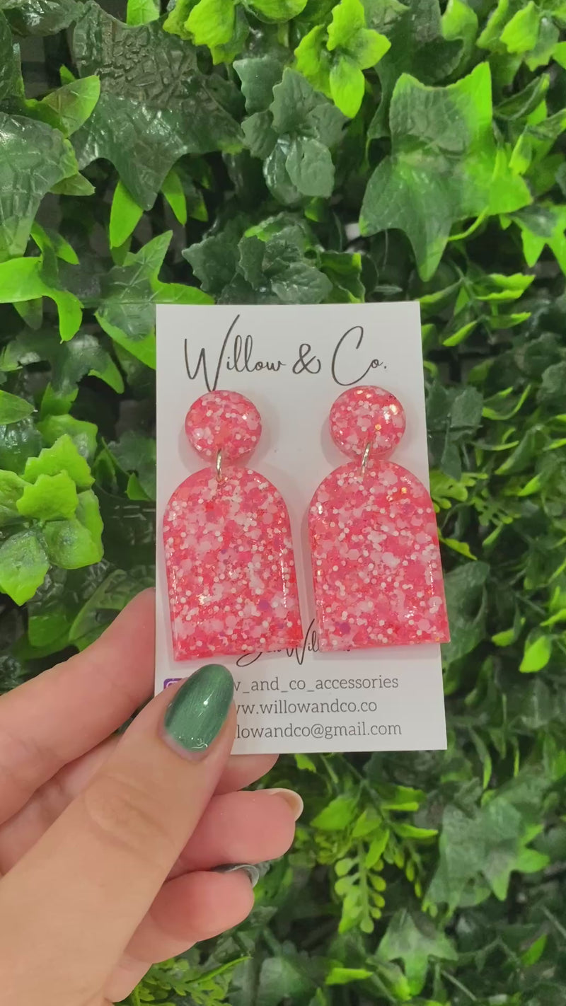 Coral Crush is a sweet, summery blend of sunshine and sparkle. Packed with juicy coral pinks, peach tones, and hints of opalescent shimmer, these glittery long arch dangles are a fresh burst of colour that feels like sunshine in earring form.