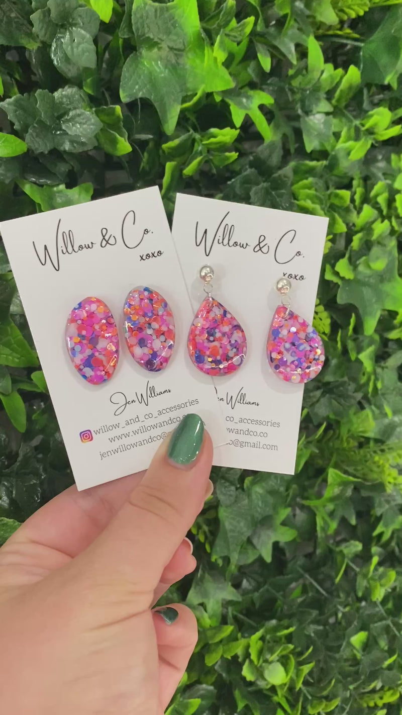 Handmade with love in Bowral, NSW, these Mini Dangle Earrings are proof that tiny doesn’t mean boring. Packed with hot pink, tangerine, purple and navy glitter, they bring playful sparkle in a compact, everyday-friendly size. Light, fun and full of personality, they’re made to make you smile.